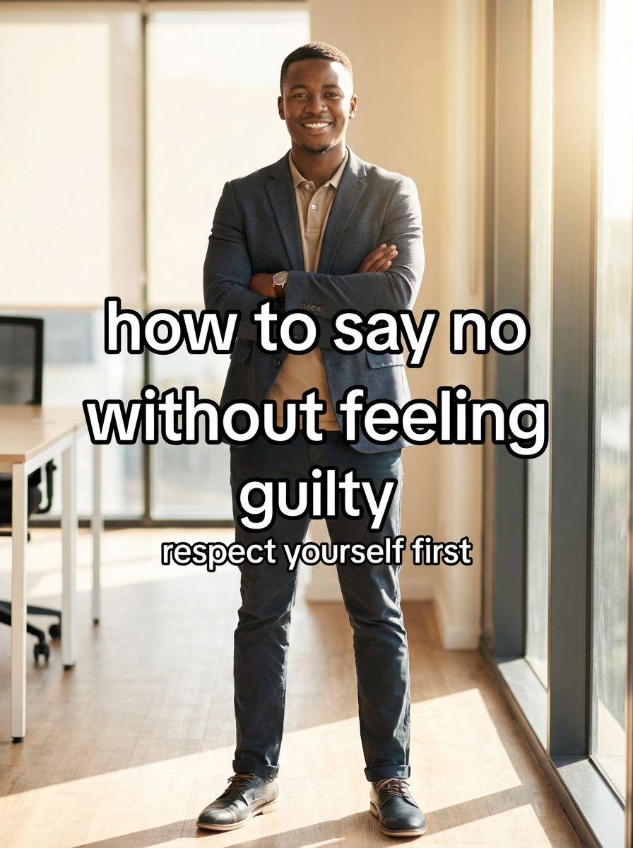 model in assertiveness training attire in professional or personal setting, confident posture, empowering lighting. TikTok-style text overlay with white text with black outline: "how to say no without feeling guilty" smaller text: "(respect yourself first)", do not show tiktok interface or logo