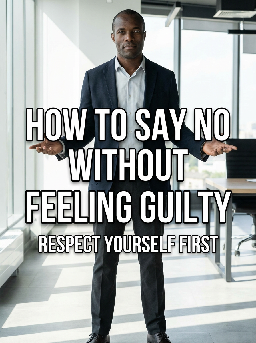 model in assertiveness training attire in professional or personal setting, confident posture, empowering lighting. instagram-style text overlay with white text with black outline: "how to say no without feeling guilty" smaller text: "(respect yourself first)", do not show instagram interface or logo
