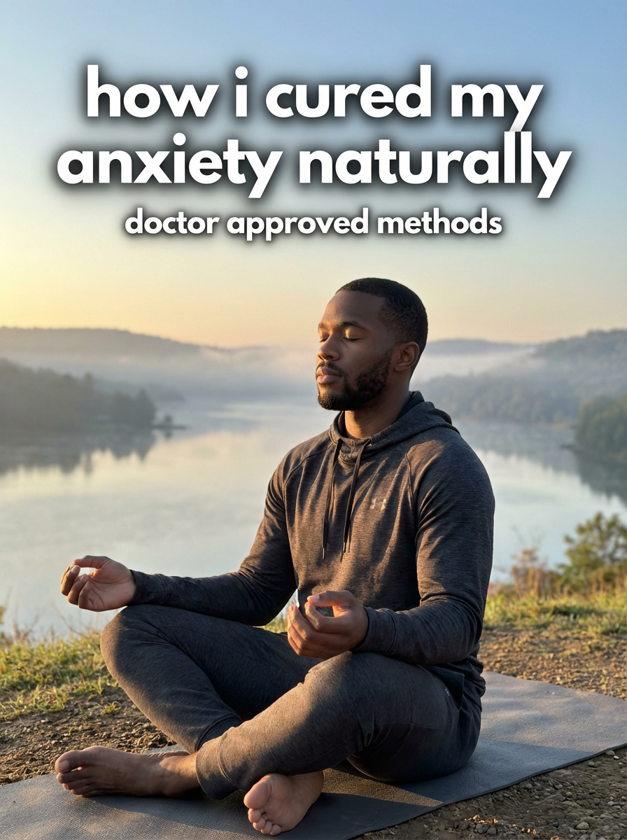 model in athletic wear in serene outdoor setting, meditation pose, sunrise/sunset lighting, peaceful expression. TikTok text overlay: "how i cured my anxiety naturally" smaller text: "(doctor approved methods)", do not show tiktok interface