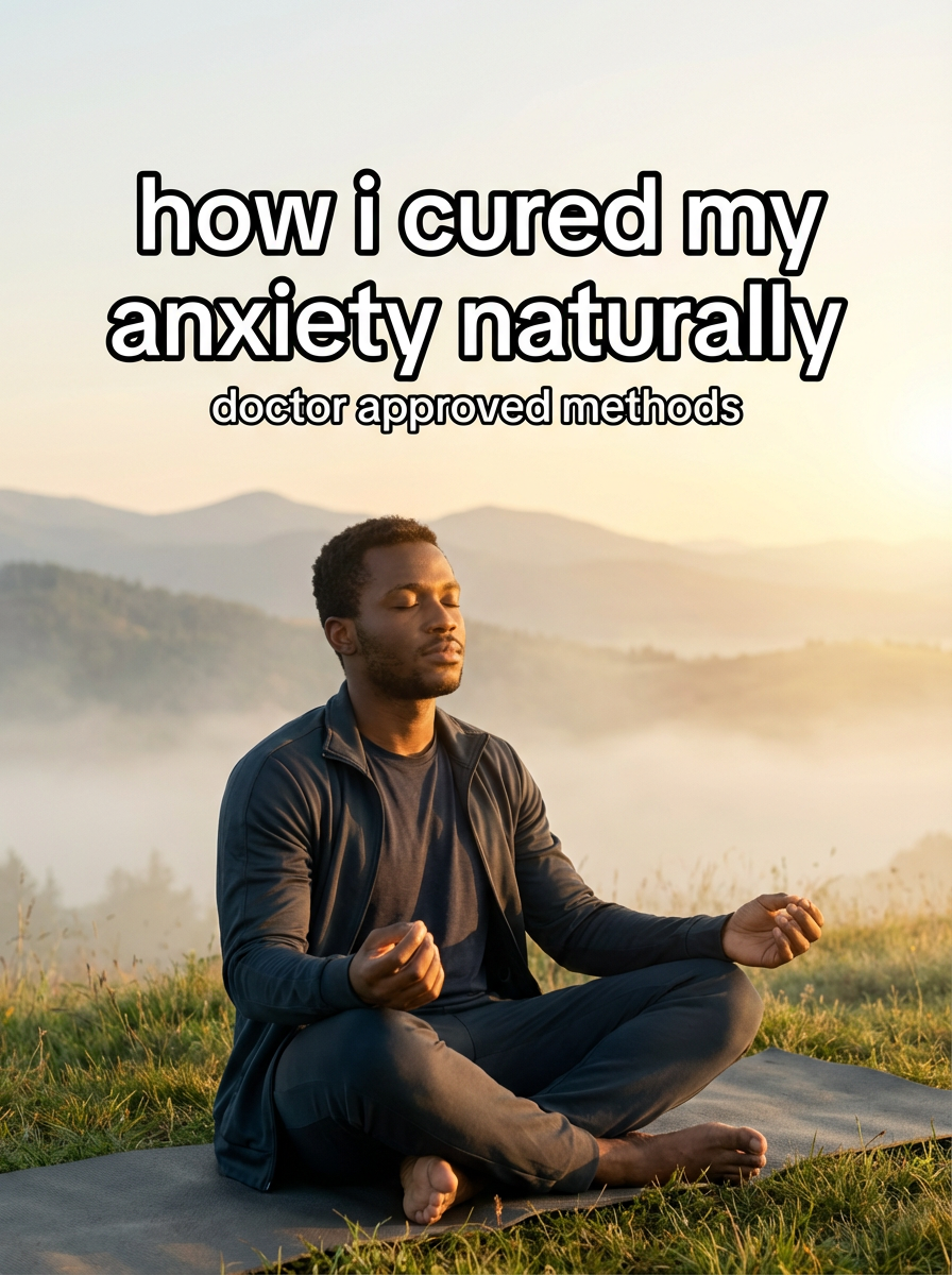 model in athletic wear in serene outdoor setting, meditation pose, sunrise/sunset lighting, peaceful expression. TikTok-style text overlay with white text with black outline: "how i cured my anxiety naturally" smaller text: "(doctor approved methods)", do not show tiktok interface or logo