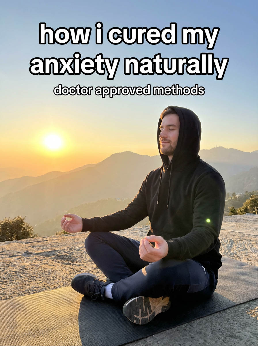 model in athletic wear in serene outdoor setting, meditation pose, sunrise/sunset lighting, peaceful expression. TikTok-style text overlay with white text with black outline: "how i cured my anxiety naturally" smaller text: "(doctor approved methods)", do not show tiktok interface or logo