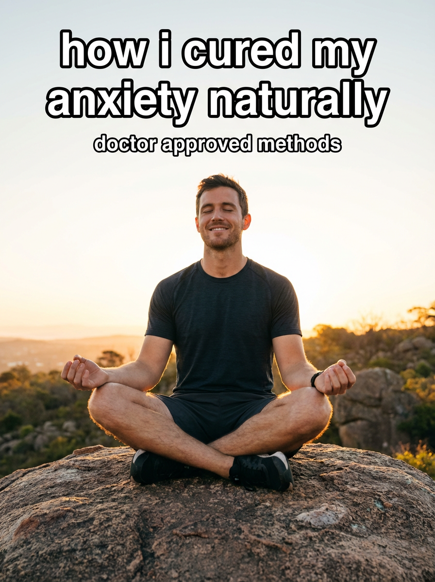 model in athletic wear in serene outdoor setting, meditation pose, sunrise/sunset lighting, peaceful expression. TikTok-style text overlay with white text with black outline: "how i cured my anxiety naturally" smaller text: "(doctor approved methods)", do not show tiktok interface or logo