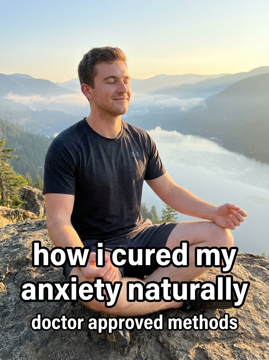 model in athletic wear in serene outdoor setting, meditation pose, sunrise/sunset lighting, peaceful expression. TikTok-style text overlay with white text with black outline: "how i cured my anxiety naturally" smaller text: "(doctor approved methods)", do not show tiktok interface or logo