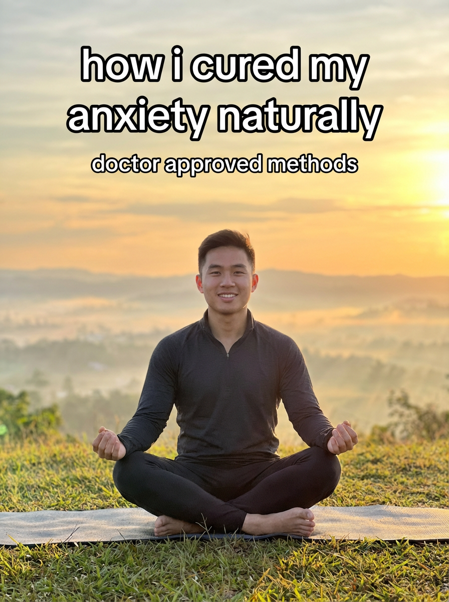 model in athletic wear in serene outdoor setting, meditation pose, sunrise/sunset lighting, peaceful expression. TikTok-style text overlay with white text with black outline: "how i cured my anxiety naturally" smaller text: "(doctor approved methods)", do not show tiktok interface or logo