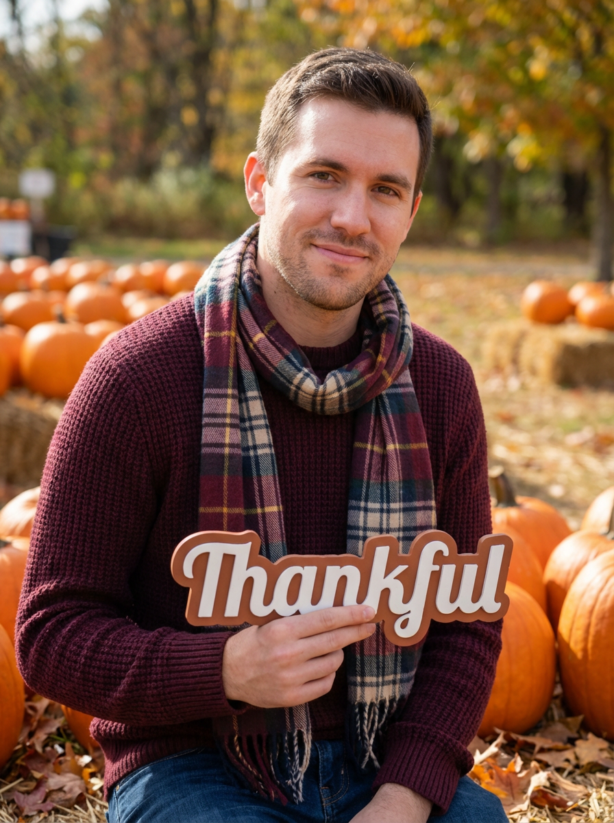 model in autumn leaves, pumpkin patch setting, cozy sweater and scarf, warm fall colors, grateful expression