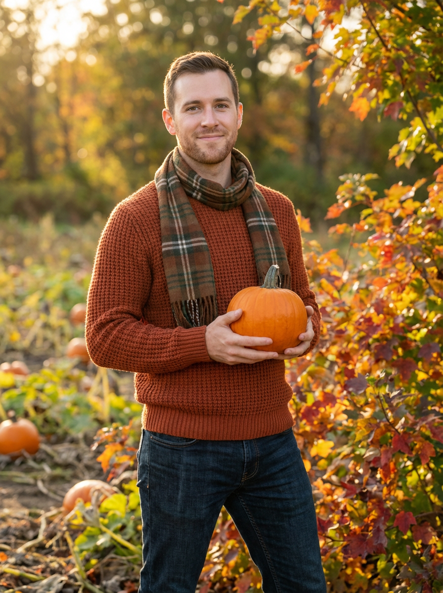 model in autumn leaves, pumpkin patch setting, cozy sweater and scarf, warm fall colors, grateful expression