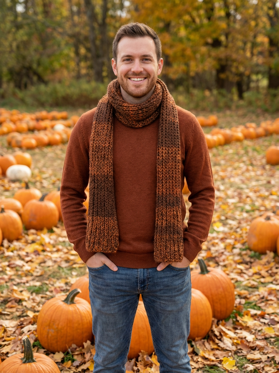 model in autumn leaves, pumpkin patch setting, cozy sweater and scarf, warm fall colors, grateful expression