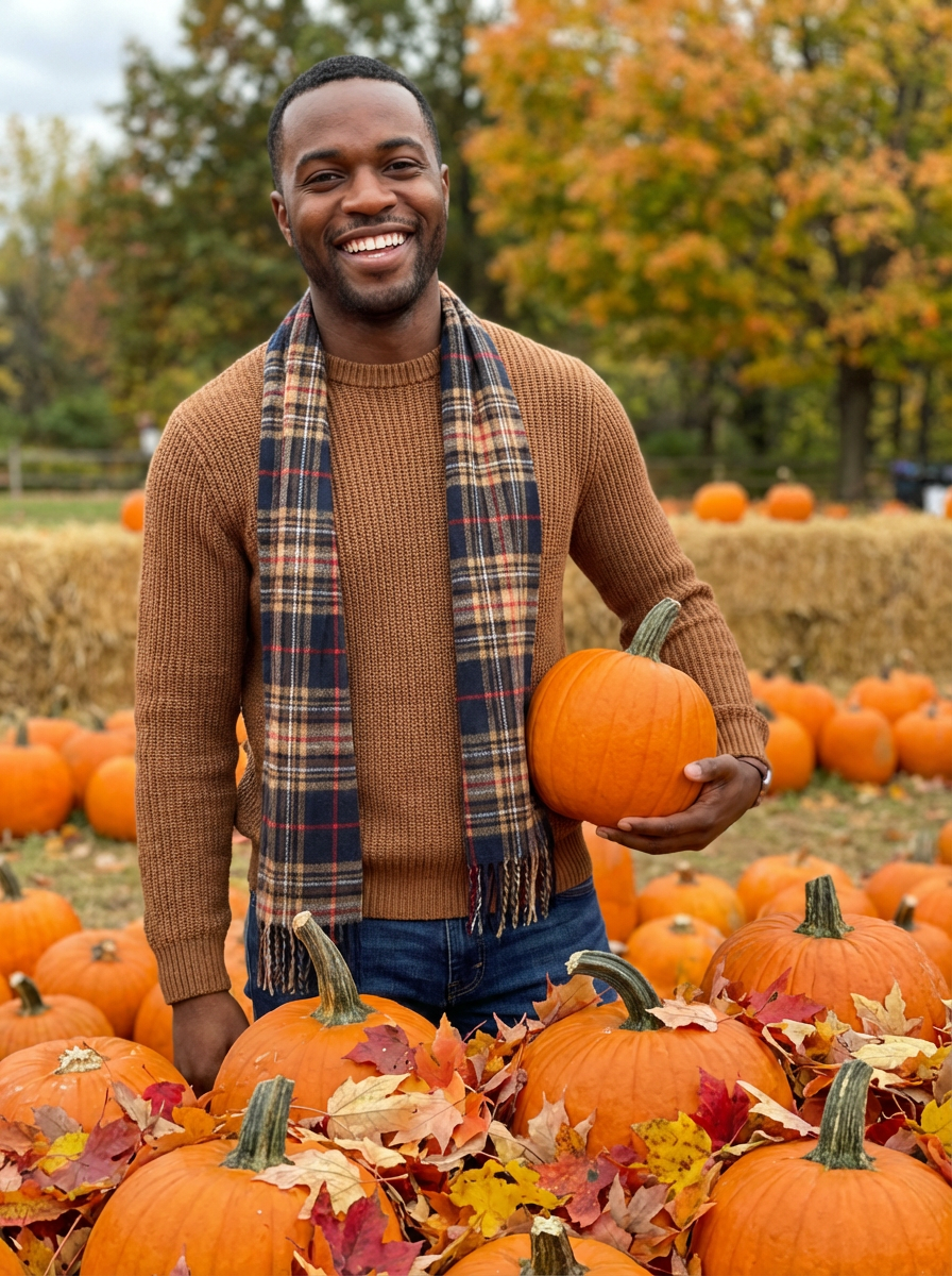 model in autumn leaves, pumpkin patch setting, cozy sweater and scarf, warm fall colors, grateful expression
