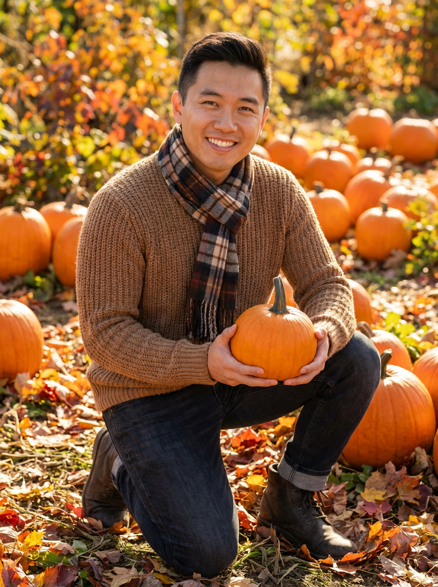 model in autumn leaves, pumpkin patch setting, cozy sweater and scarf, warm fall colors, grateful expression