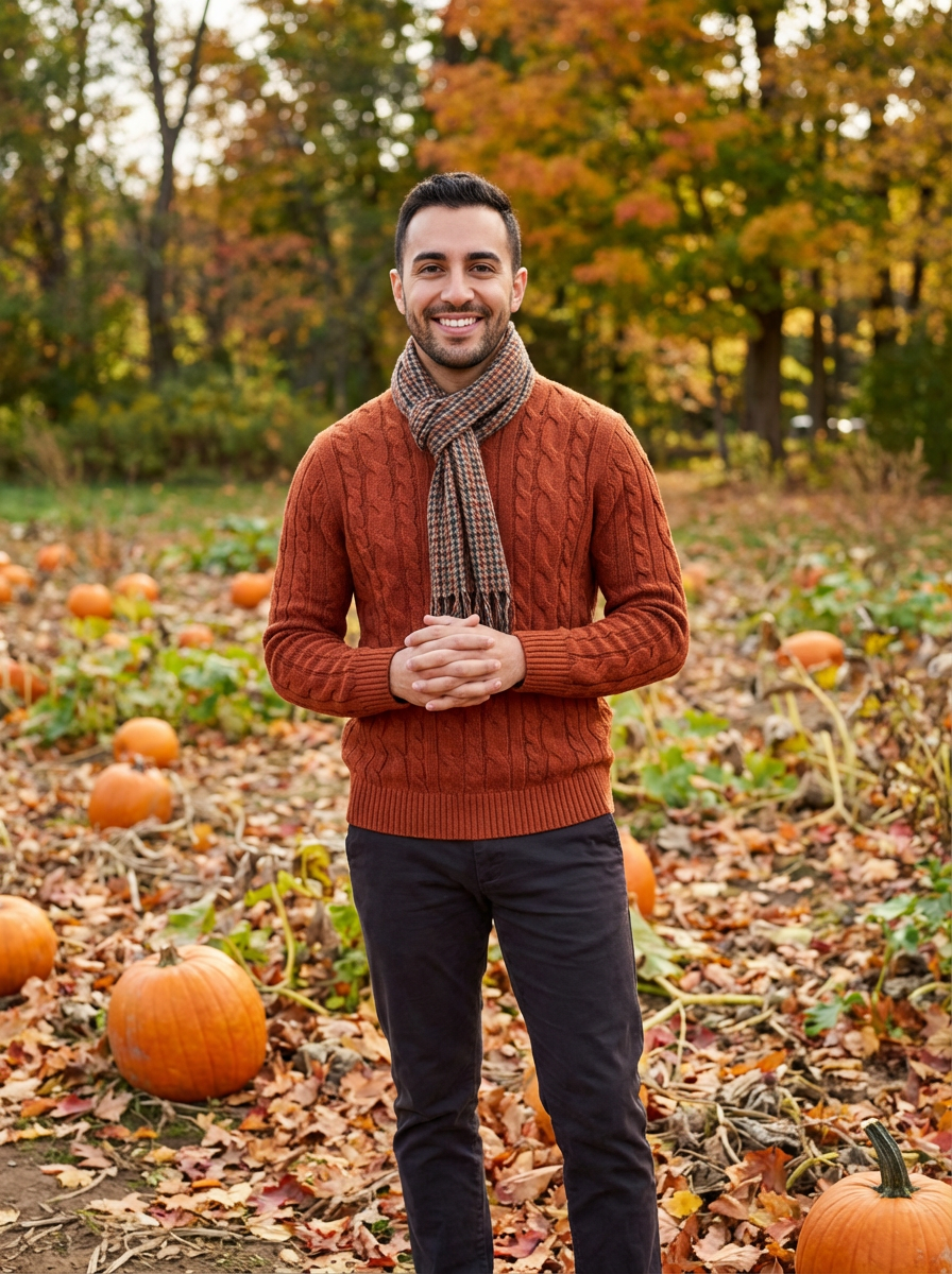 model in autumn leaves, pumpkin patch setting, cozy sweater and scarf, warm fall colors, grateful expression