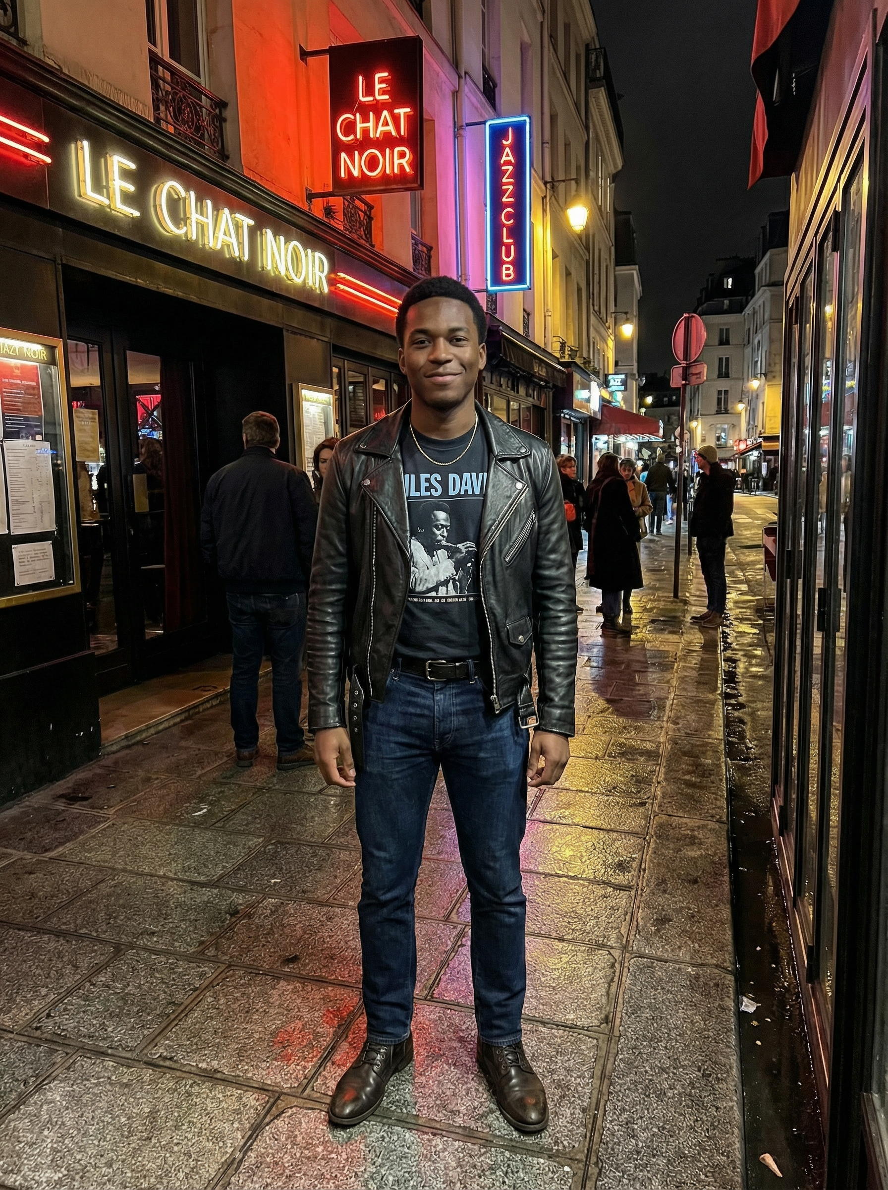 model in band tee, leather jacket, jeans, boots in Saint-Germain-des-Prés jazz club district, artistic nightlife scene, vintage music venue atmosphere, creative cultural quarter, moody evening lighting, artistic Paris nightlife
