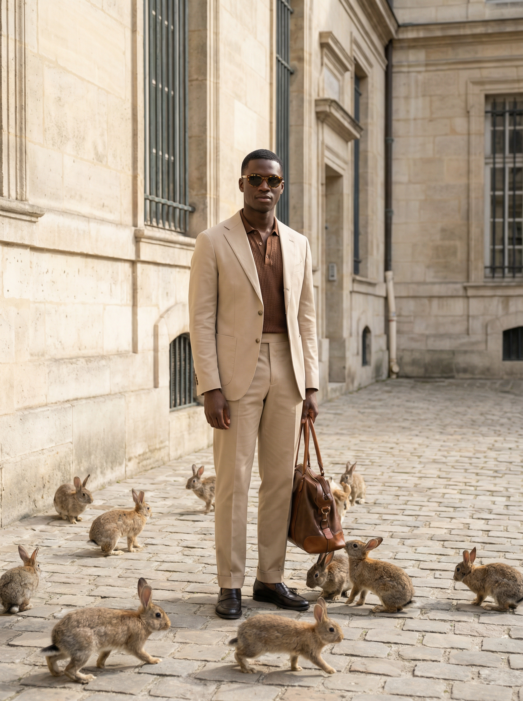 model in beige tailored suit, knit polo, loafers, sunglasses in a quiet cobblestone courtyard beside an elegant building facade, 15 rabbits hopping around the model’s feet and gathering near the bag, calm composed pose, luxury editorial street style, soft morning light, ultra photorealistic