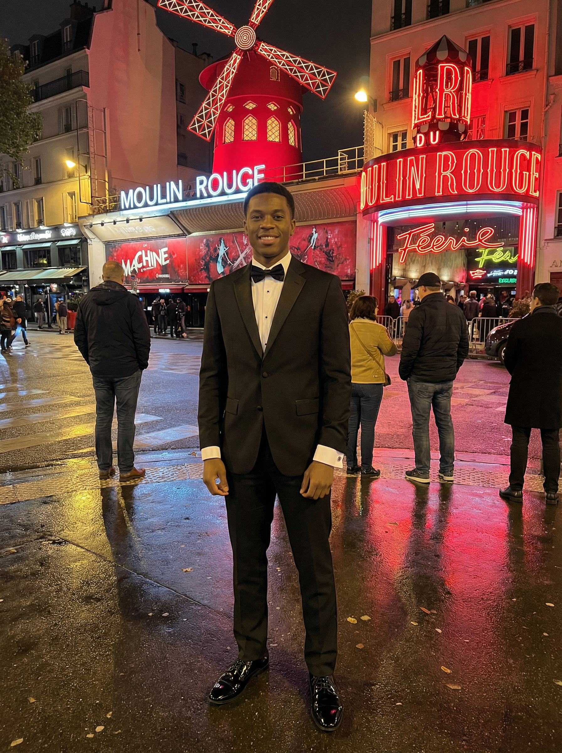 model in black tie tuxedo, bow tie, dress shoes, cufflinks at Moulin Rouge entrance, iconic cabaret venue, red windmill sign, evening entertainment district, glamorous nightlife, theatrical Parisian culture