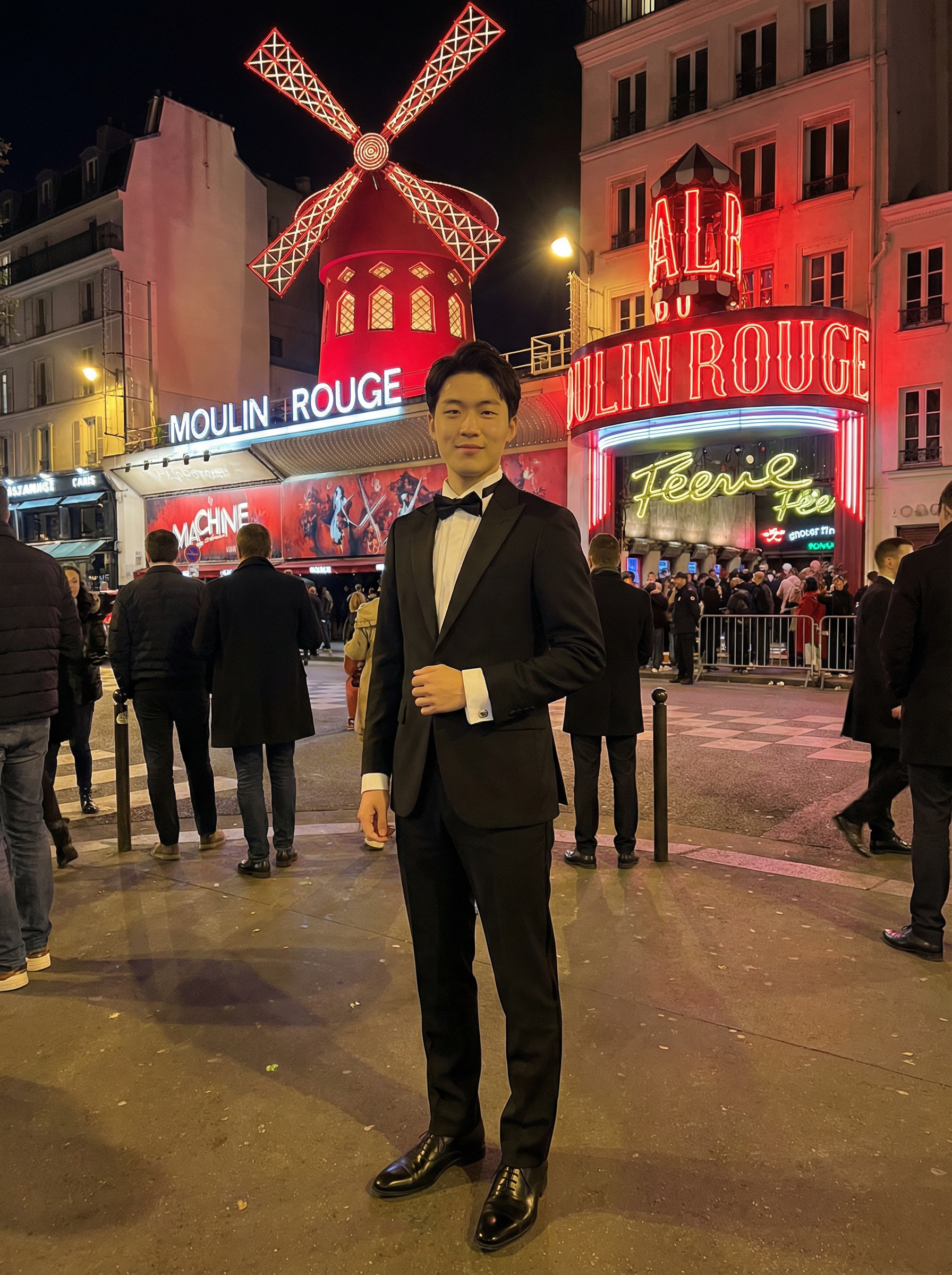 model in black tie tuxedo, bow tie, dress shoes, cufflinks at Moulin Rouge entrance, iconic cabaret venue, red windmill sign, evening entertainment district, glamorous nightlife, theatrical Parisian culture