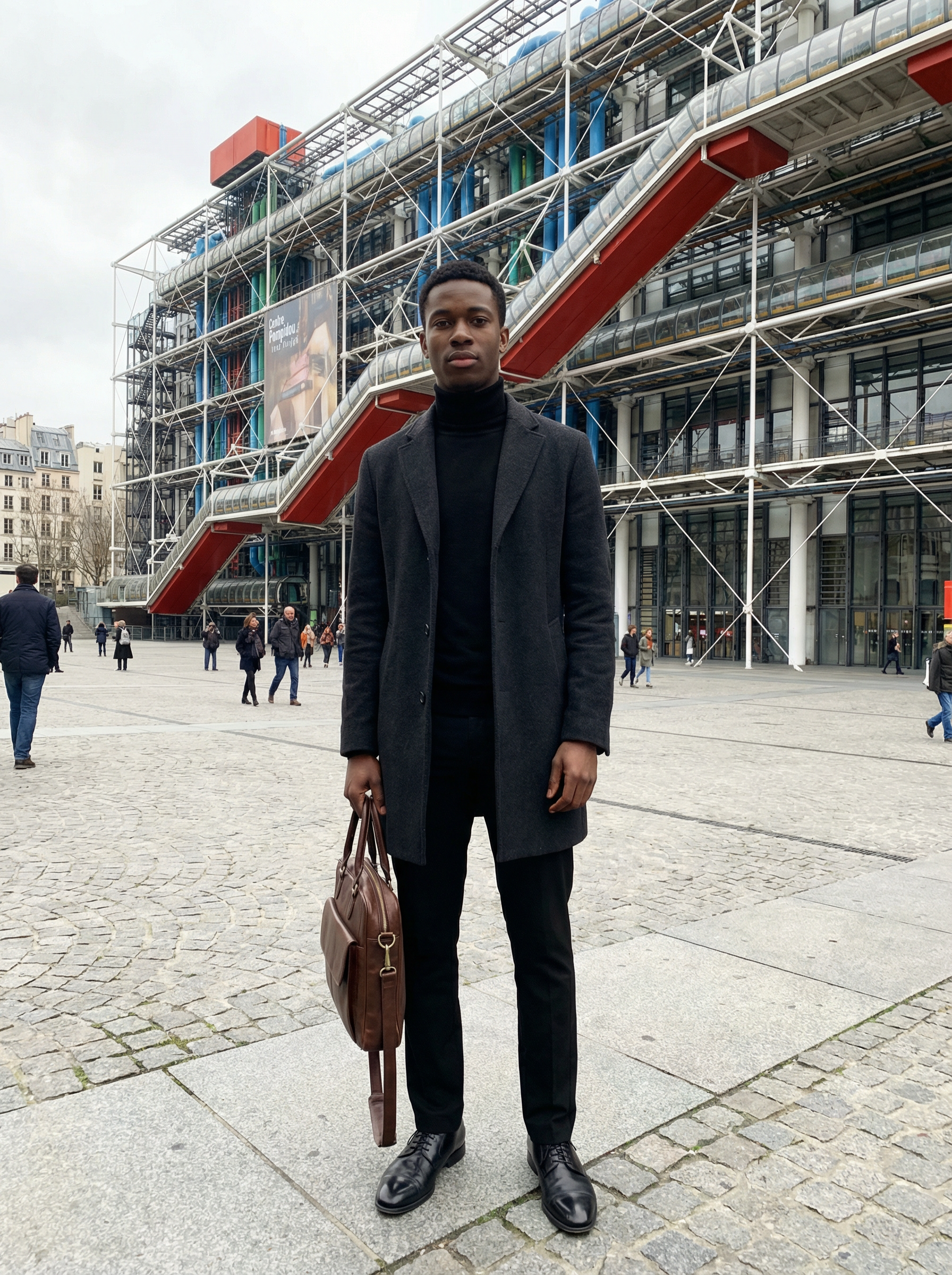 model in black turtleneck, dark coat, dress shoes, leather bag at modern art museum Centre Pompidou, contemporary architecture, colorful building exterior, artistic cultural scene, urban sophistication, modern Paris aesthetic