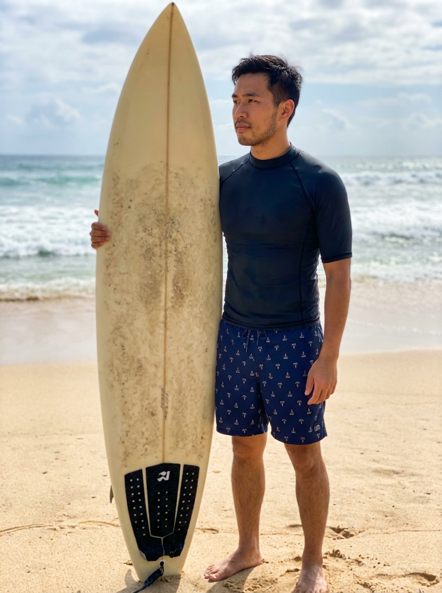 model in board shorts with surfboard on the beach, ready to ride the waves