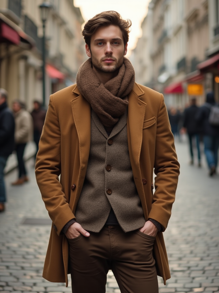 model in brown boots, camel coat, and mocha scarf, layered earth tones, sophisticated autumn style