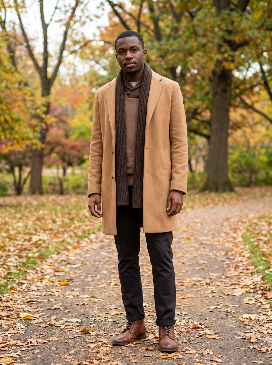 model in brown boots, camel coat, and mocha scarf, layered earth tones, sophisticated autumn style