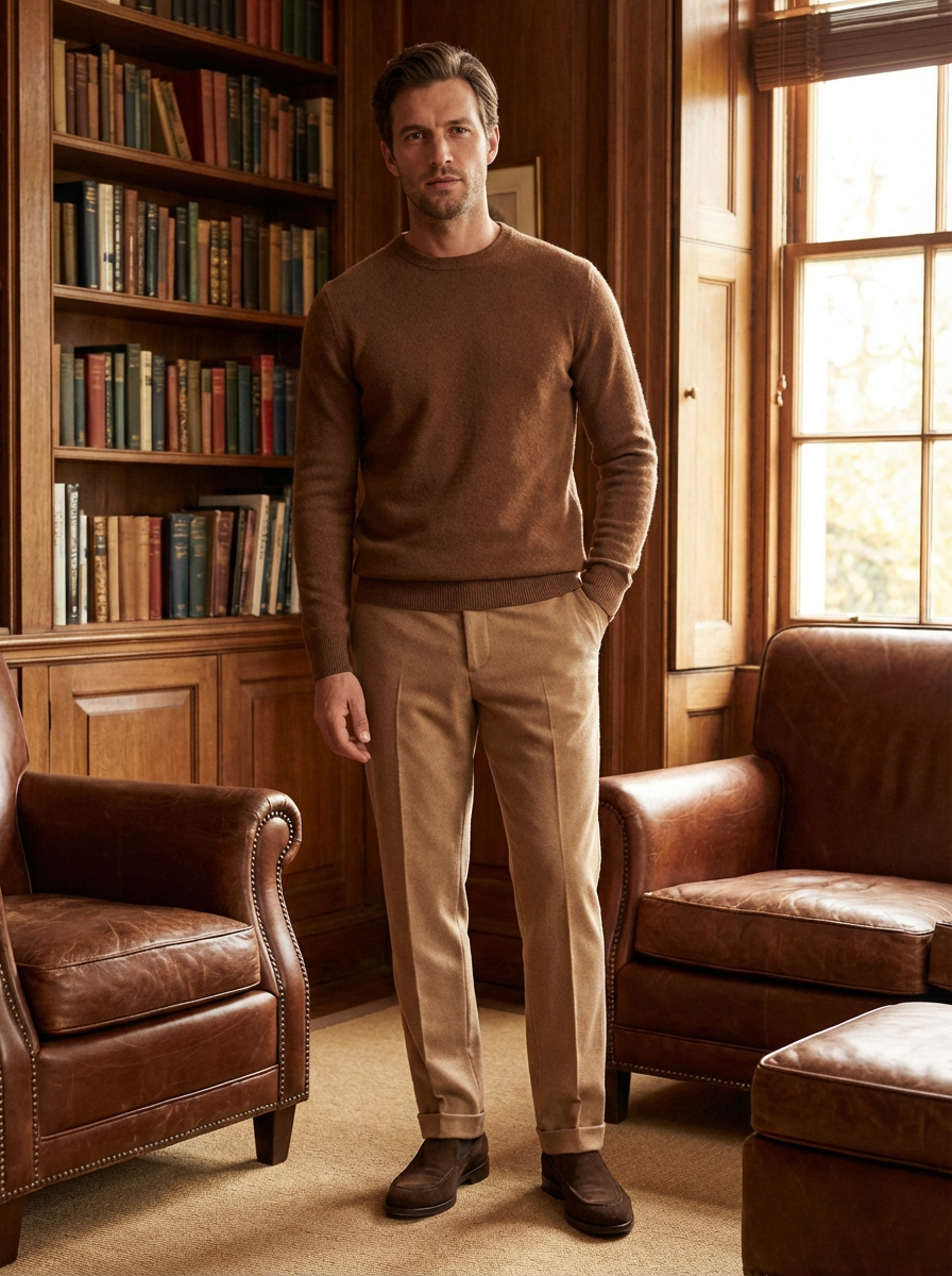model in brown cashmere sweater with tan trousers, premium materials, rich earth tone palette, elegant composition