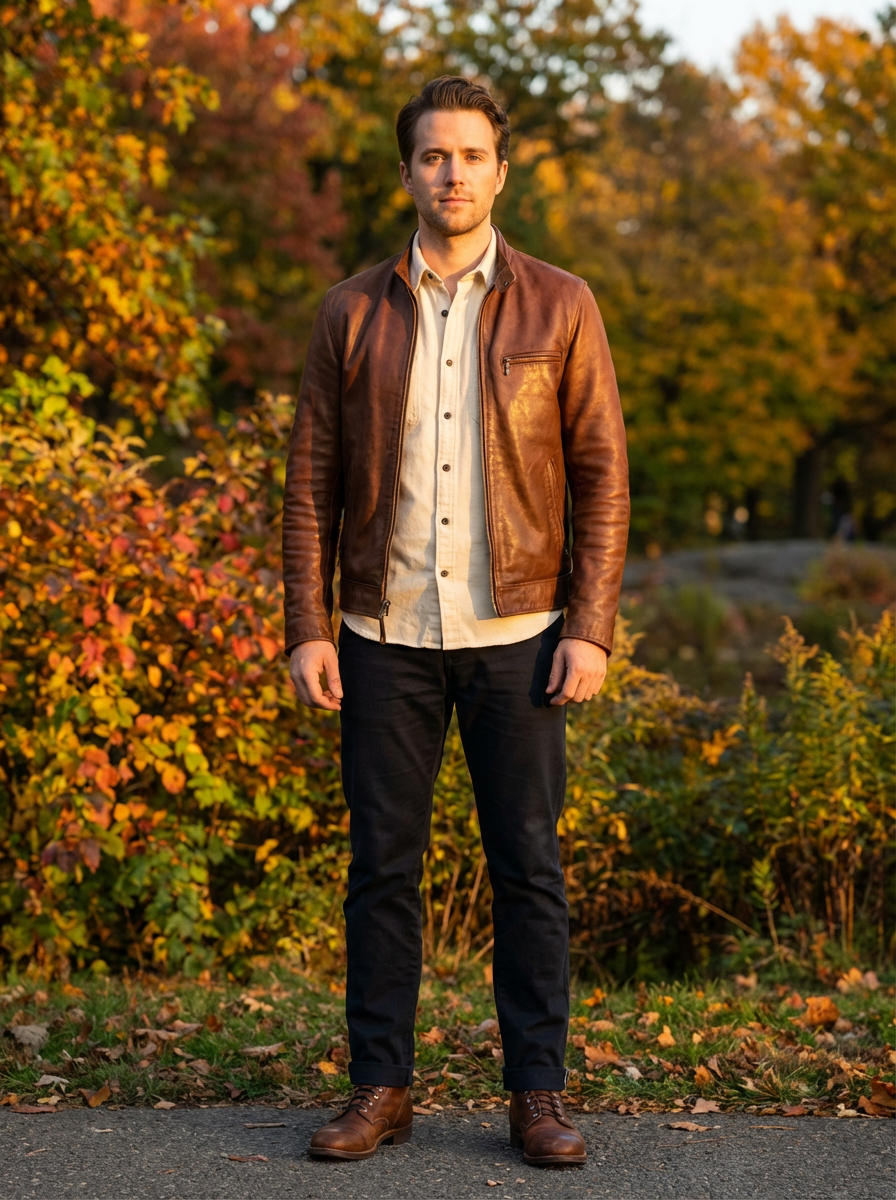 model in brown leather jacket over cream shirt, autumn-inspired palette, elegant earth tones, golden hour lighting