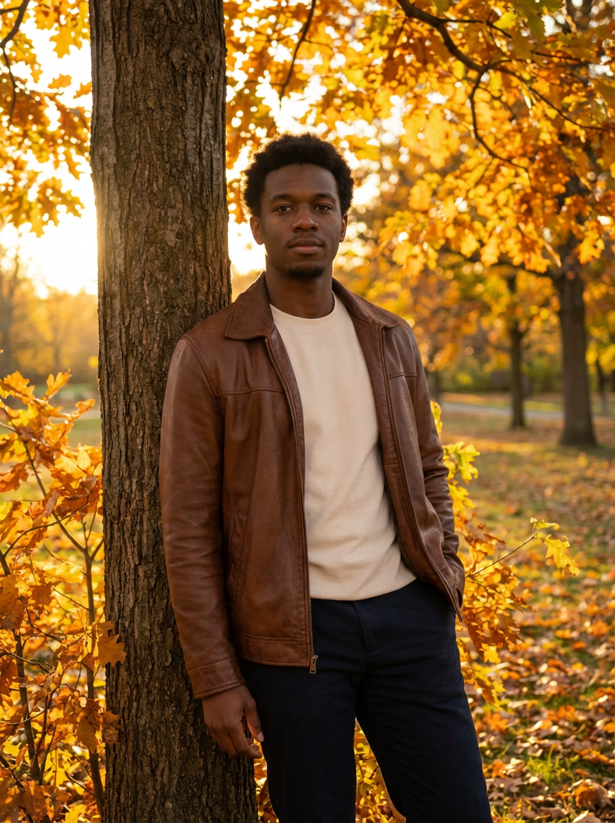 model in brown leather jacket over cream shirt, autumn-inspired palette, elegant earth tones, golden hour lighting