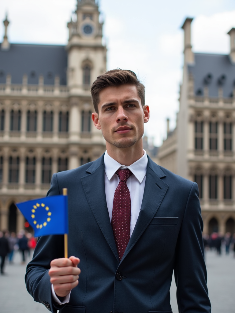 model in Brussels at the Grand Place, wearing a tailored suit with European flag tie, holding a small European flag, the ornate historic buildings creating a picturesque European backdrop