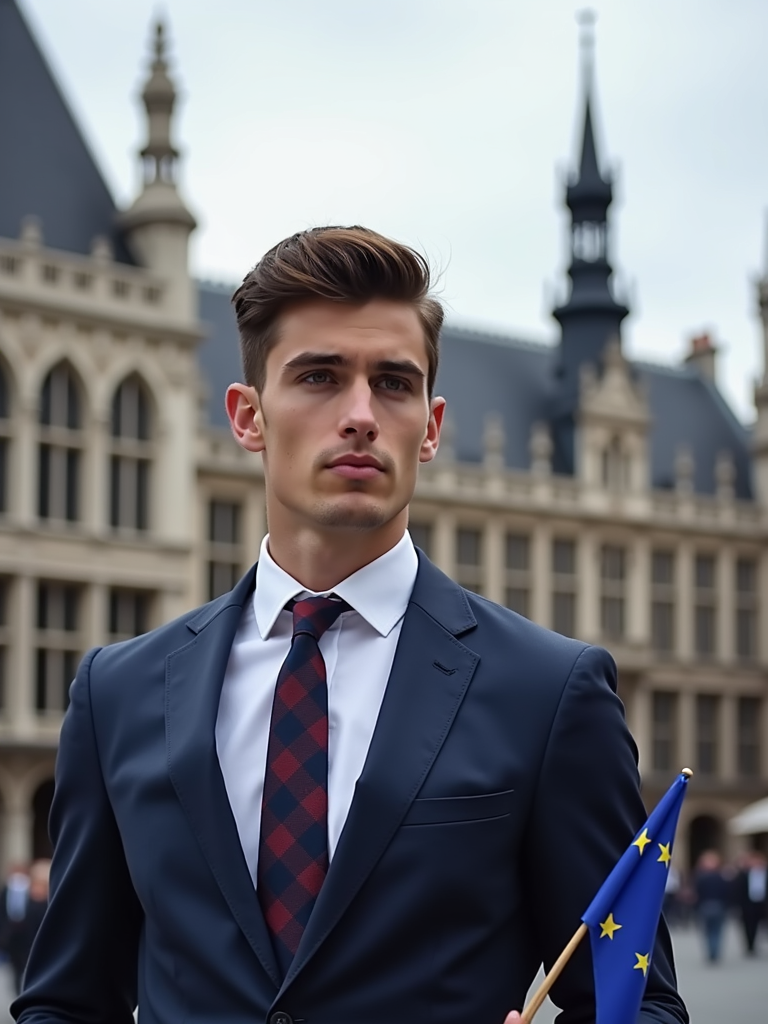 model in Brussels at the Grand Place, wearing a tailored suit with European flag tie, holding a small European flag, the ornate historic buildings creating a picturesque European backdrop