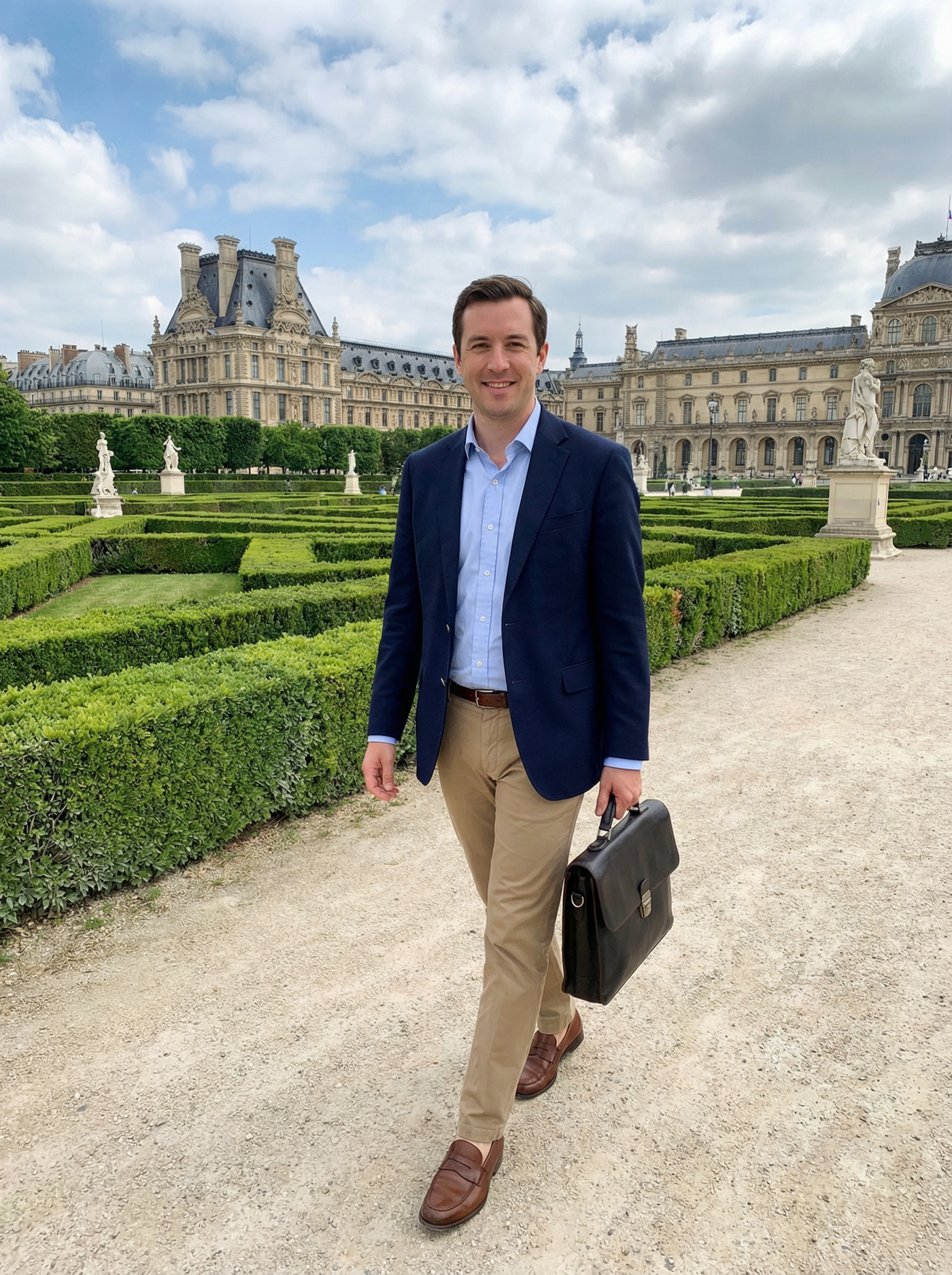 model in business casual shirt, trousers, loafers, briefcase walking through Tuileries Garden, formal French garden design, geometric landscaping, palace views, sophisticated garden stroll, classical French elegance
