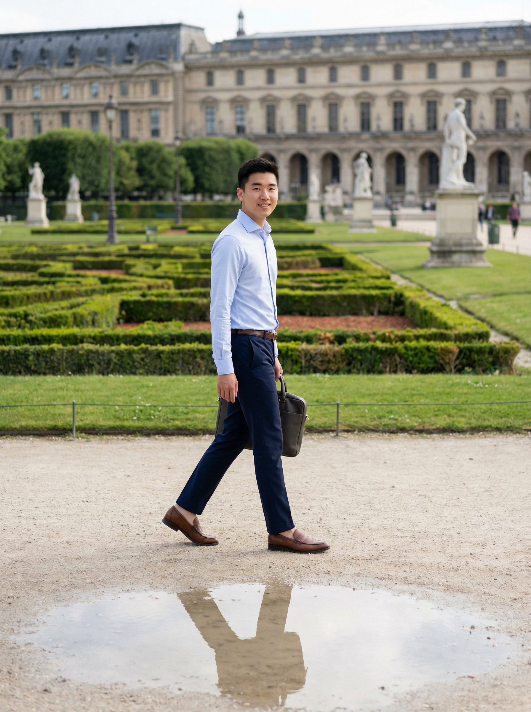 model in business casual shirt, trousers, loafers, briefcase walking through Tuileries Garden, formal French garden design, geometric landscaping, palace views, sophisticated garden stroll, classical French elegance