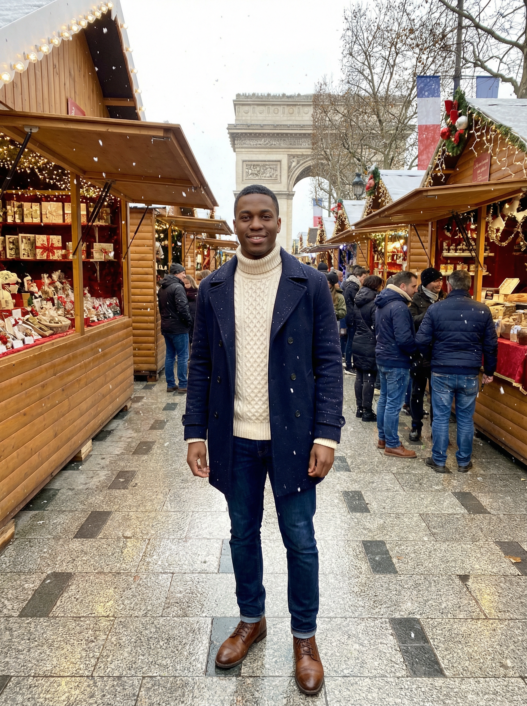 model in cable knit sweater, dark jeans, boots, wool coat at Christmas markets near Champs-Élysées, festive holiday atmosphere, twinkling lights, wooden stalls, warm winter clothing, seasonal Parisian magic
