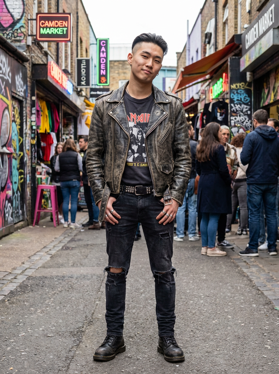 model in Camden Market, eclectic colorful background, edgy London style, alternative vibe
