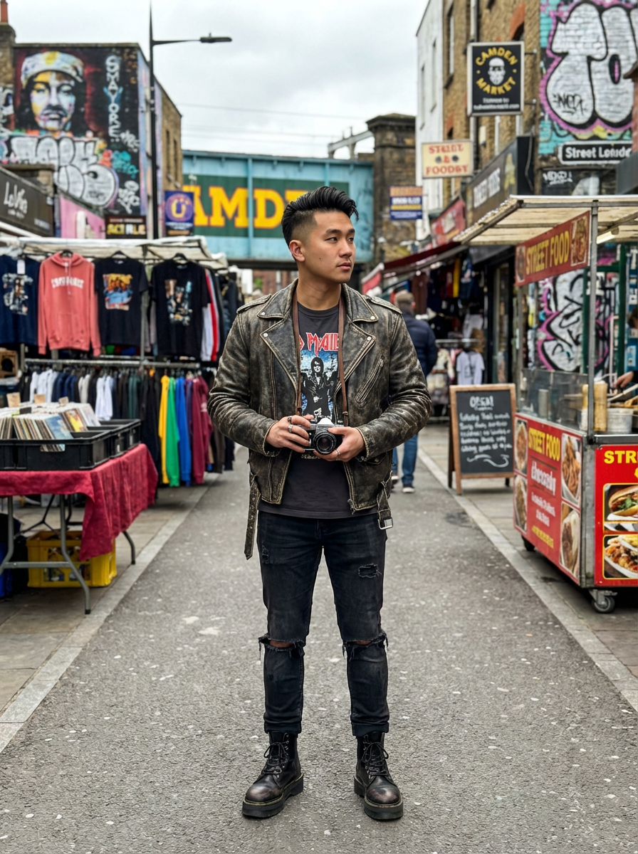 model in Camden Market, eclectic colorful background, edgy London style, alternative vibe