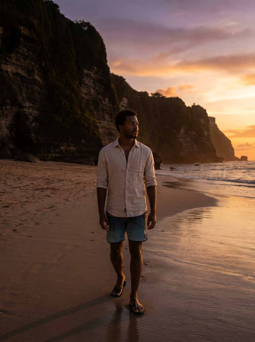 model in casual beach attire walking along pristine beach in Uluwatu at sunset, dramatic cliffs in background