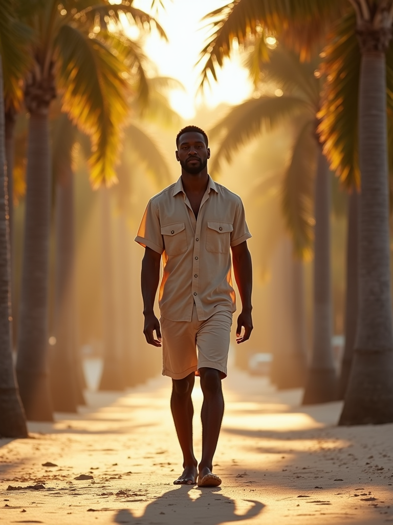 model in casual beach outfit walking through tunnel of palm trees, golden sunlight filtering through