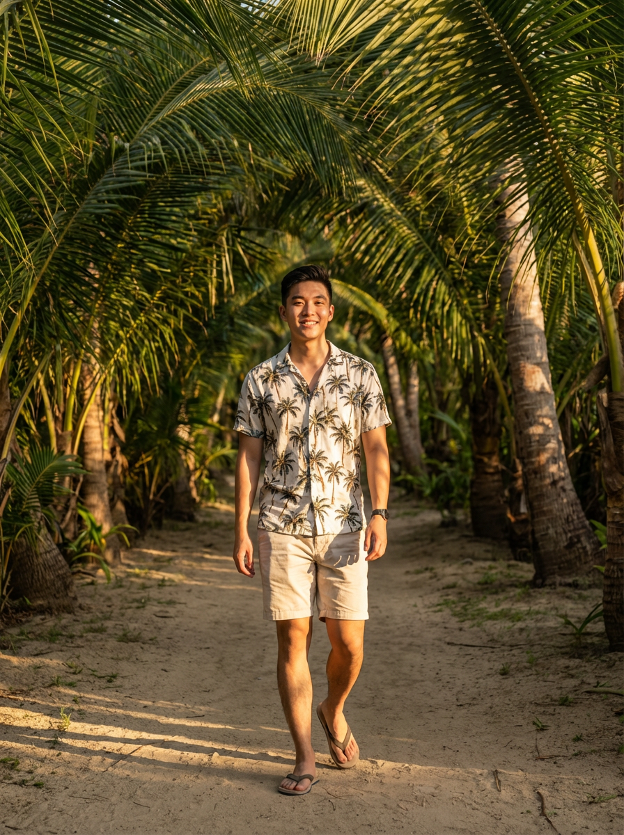 model in casual beach outfit walking through tunnel of palm trees, golden sunlight filtering through