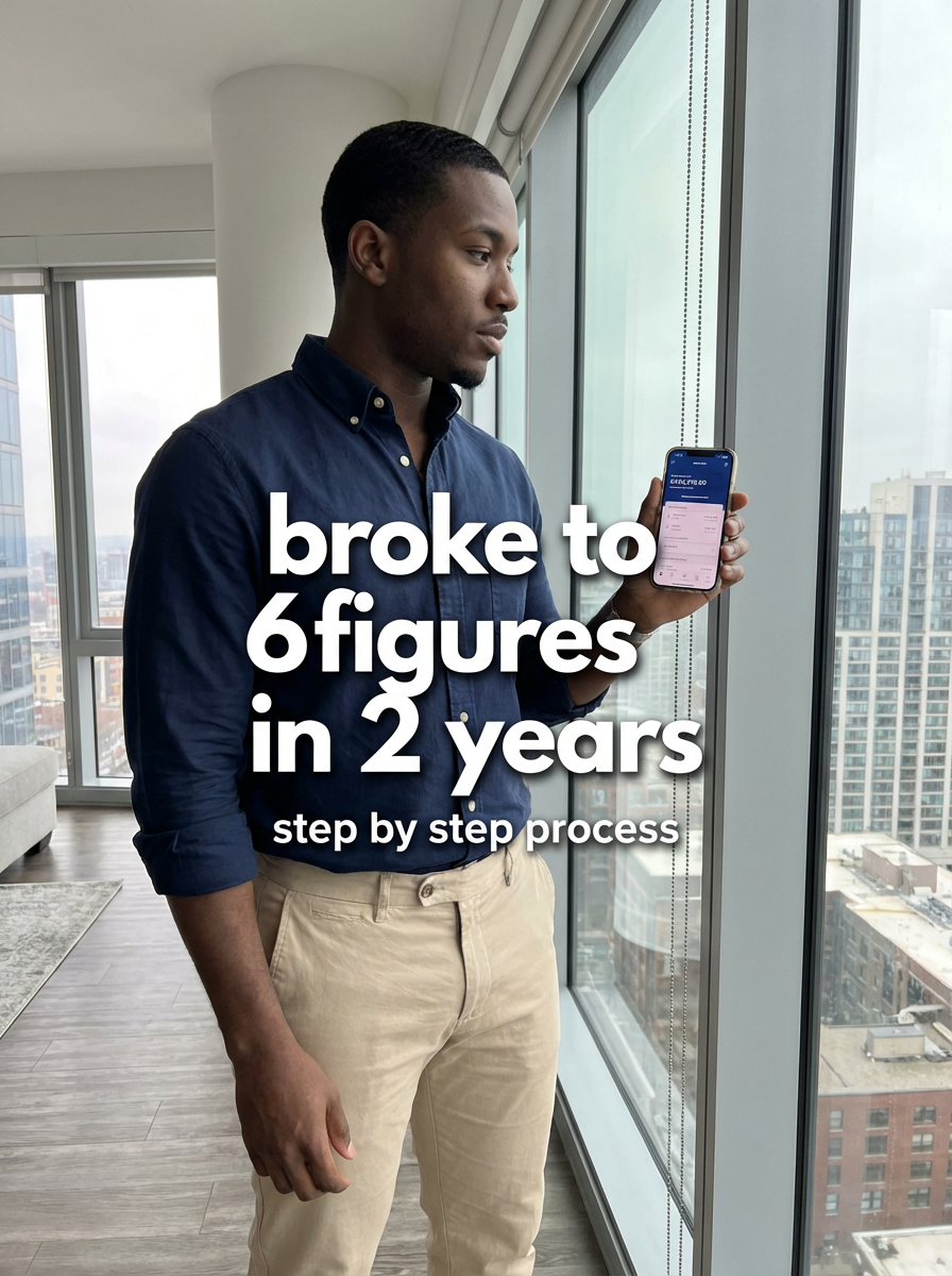 model in casual button-up and chinos standing in modern apartment with city view, holding phone showing bank app, natural lighting. TikTok text overlay: "broke to 6 figures in 2 years" smaller text: "(step by step process)", do not show tiktok interface