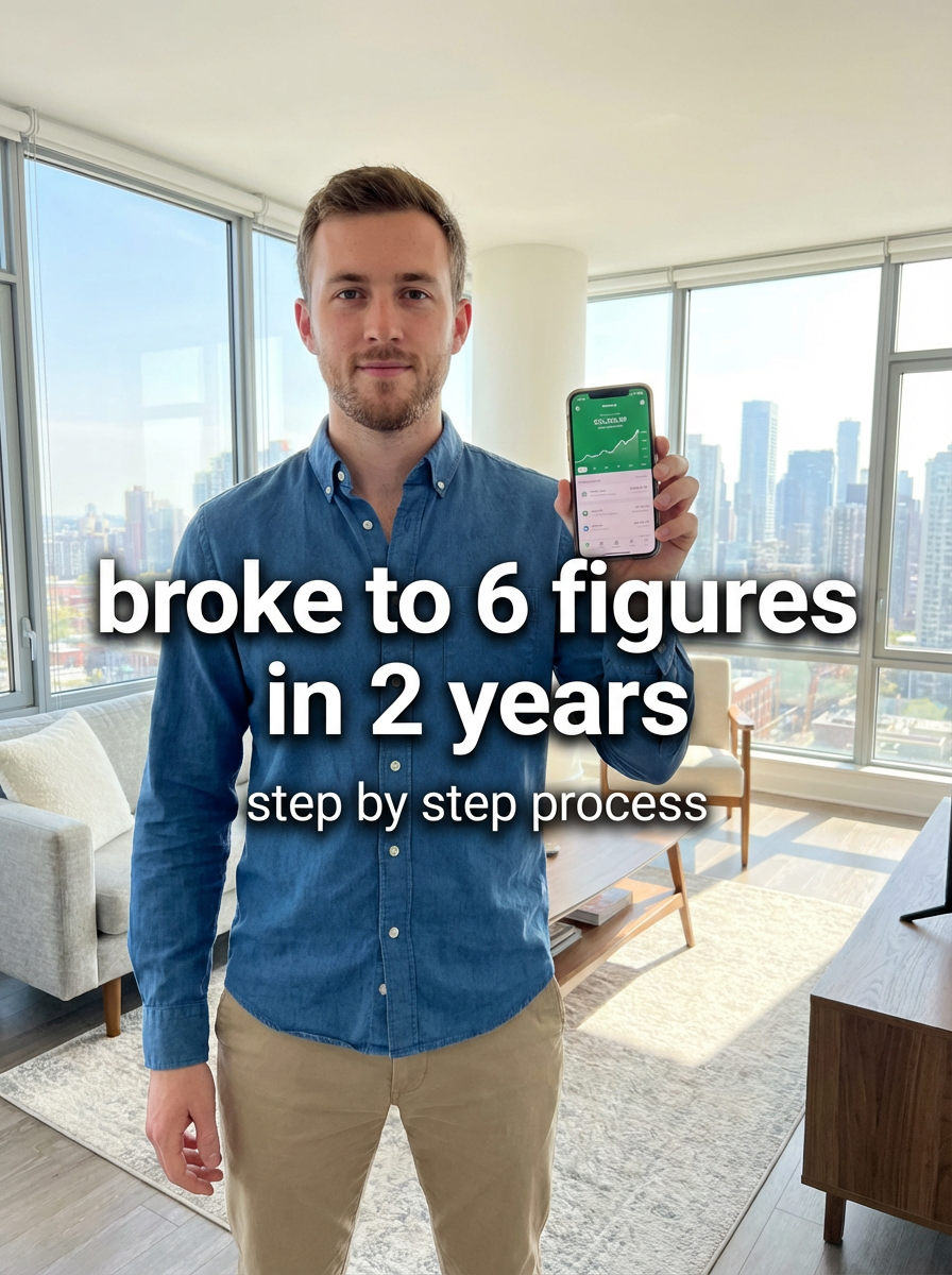 model in casual button-up and chinos standing in modern apartment with city view, holding phone showing bank app, natural lighting. TikTok text overlay: "broke to 6 figures in 2 years" smaller text: "(step by step process)", do not show tiktok interface