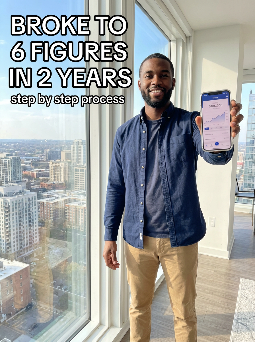 model in casual button-up and chinos standing in modern apartment with city view, holding phone showing bank app, natural lighting. TikTok-style text overlay with white text with black outline: "broke to 6 figures in 2 years" smaller text: "(step by step process)", do not show tiktok interface or logo