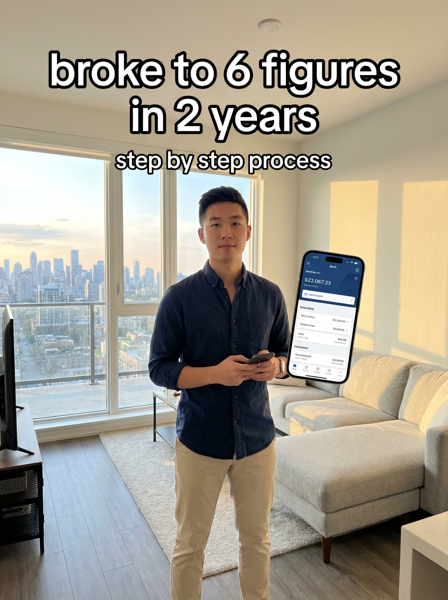model in casual button-up and chinos standing in modern apartment with city view, holding phone showing bank app, natural lighting. TikTok-style text overlay with white text with black outline: "broke to 6 figures in 2 years" smaller text: "(step by step process)", do not show tiktok interface or logo