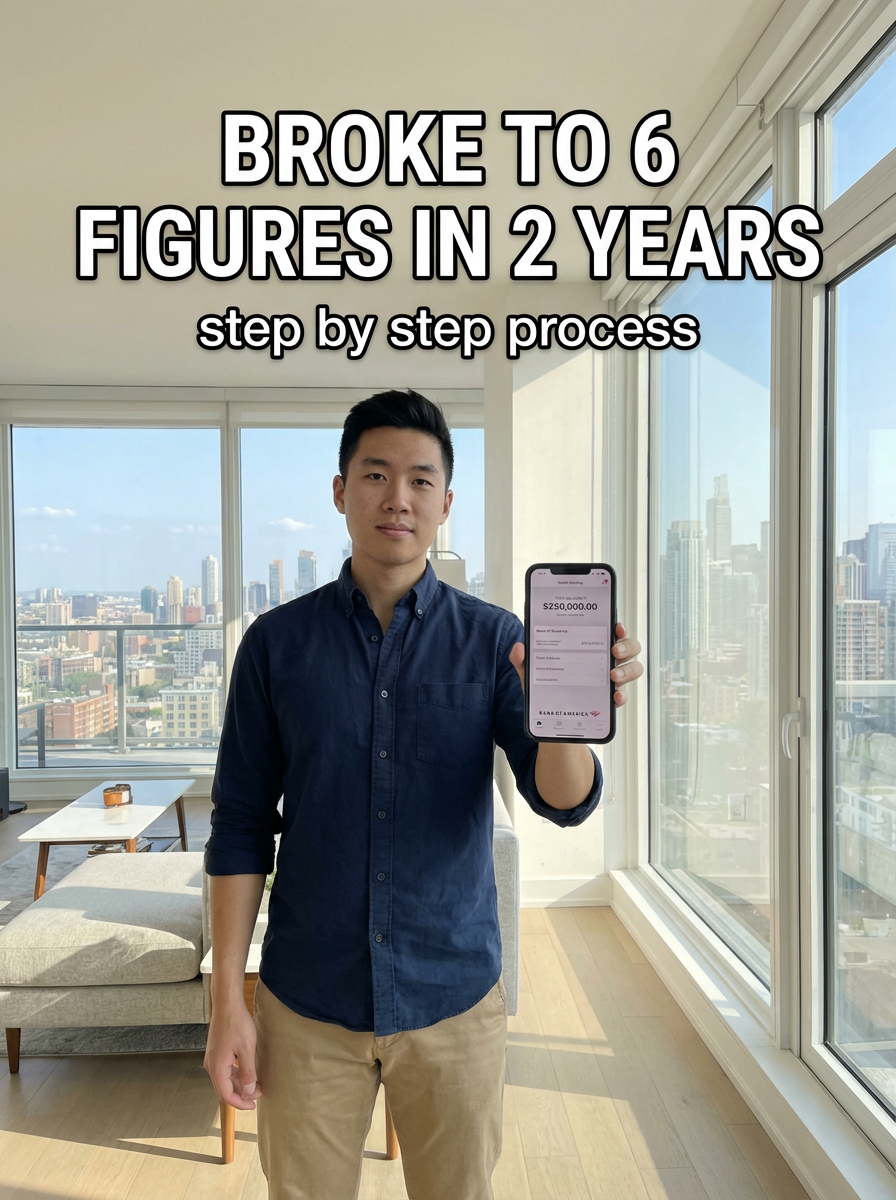 model in casual button-up and chinos standing in modern apartment with city view, holding phone showing bank app, natural lighting. TikTok-style text overlay with white text with black outline: "broke to 6 figures in 2 years" smaller text: "(step by step process)", do not show tiktok interface or logo