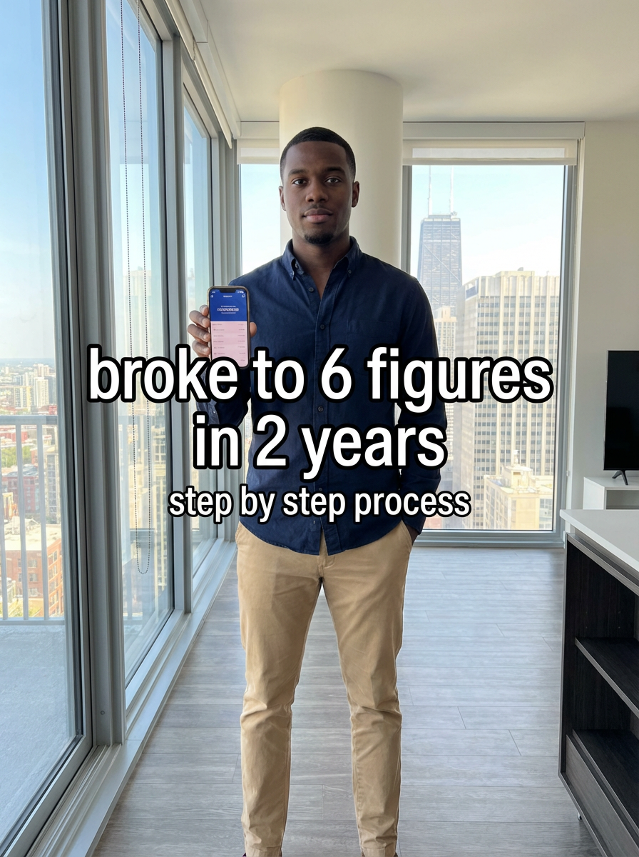 model in casual button-up and chinos standing in modern apartment with city view, holding phone showing bank app, natural lighting. TikTok-style text overlay with white text with black outline: "broke to 6 figures in 2 years" smaller text: "(step by step process)", do not show tiktok interface or logo