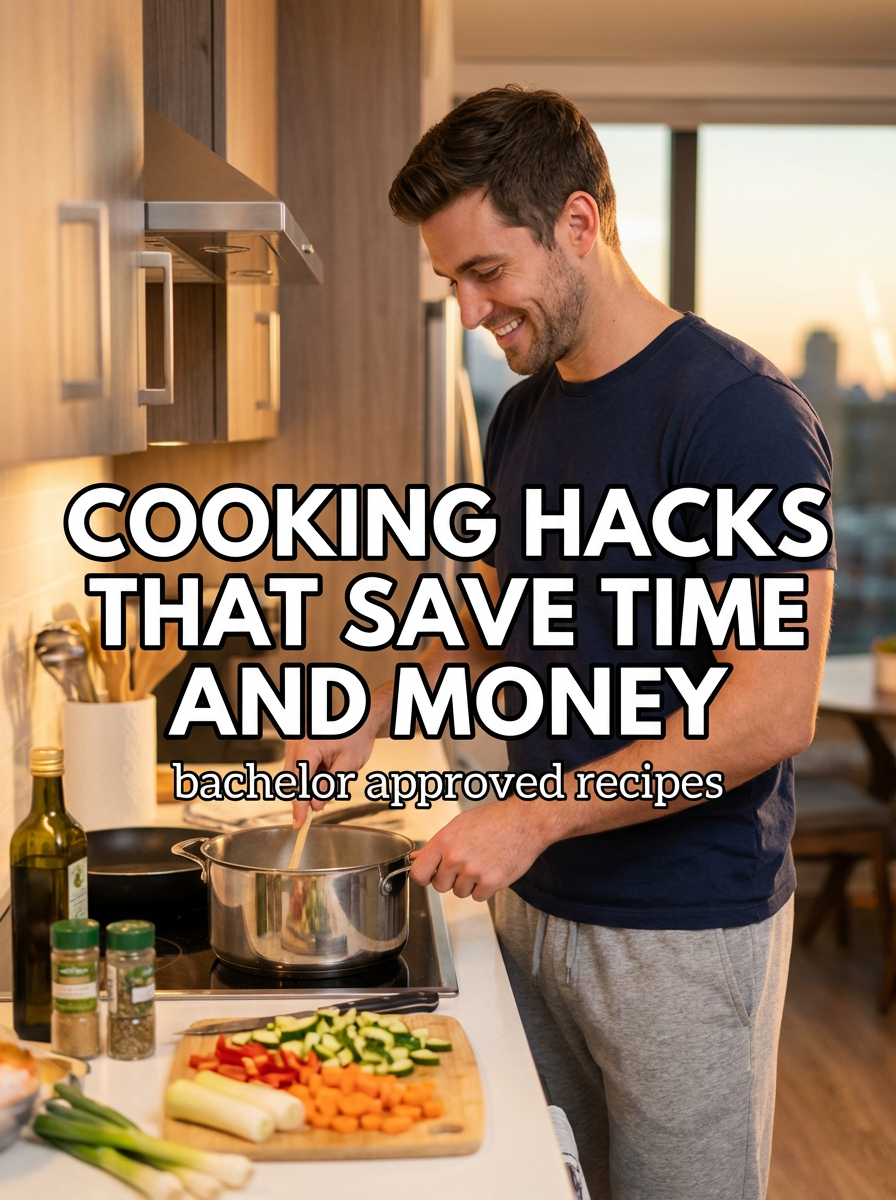 model in casual clothes in modern kitchen, cooking, ingredients spread out, warm home lighting. TikTok-style text overlay with white text with black outline: "cooking hacks that save time and money" smaller text: "(bachelor approved recipes)", do not show tiktok interface or logo