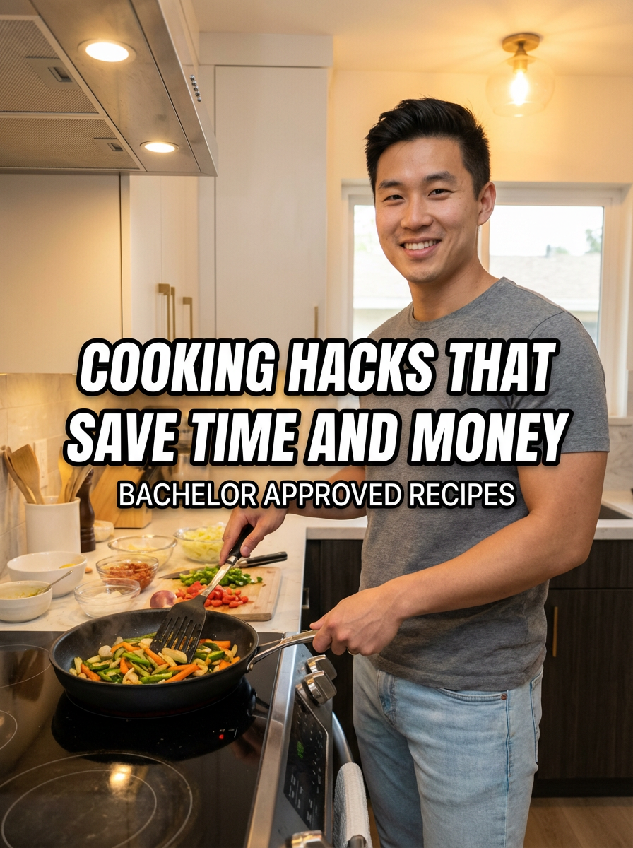 model in casual clothes in modern kitchen, cooking, ingredients spread out, warm home lighting. TikTok-style text overlay with white text with black outline: "cooking hacks that save time and money" smaller text: "(bachelor approved recipes)", do not show tiktok interface or logo