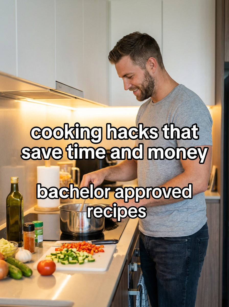 model in casual clothes in modern kitchen, cooking, ingredients spread out, warm home lighting. TikTok-style text overlay with white text with black outline: "cooking hacks that save time and money" smaller text: "(bachelor approved recipes)", do not show tiktok interface or logo