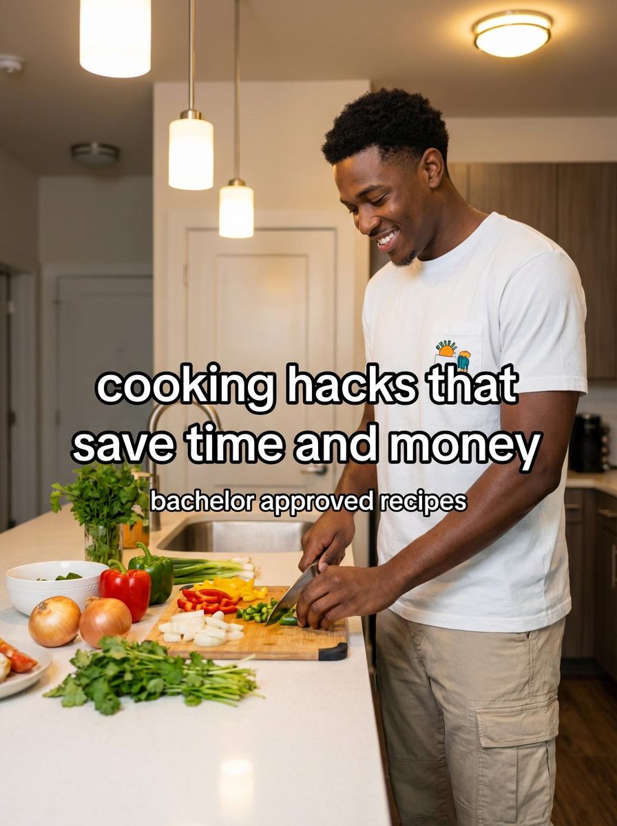 model in casual clothes in modern kitchen, cooking, ingredients spread out, warm home lighting. TikTok-style text overlay with white text with black outline: "cooking hacks that save time and money" smaller text: "(bachelor approved recipes)", do not show tiktok interface or logo
