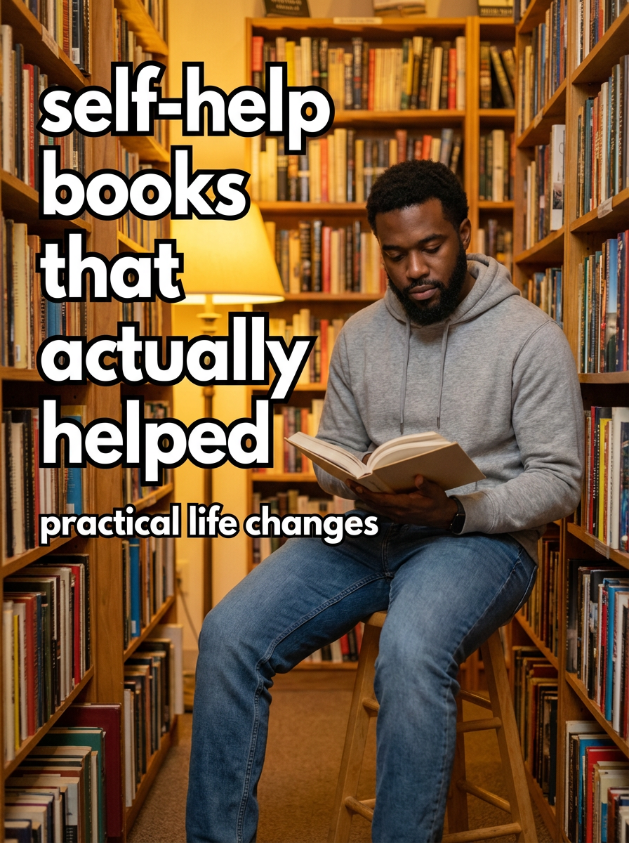 model in casual hoodie and jeans in bookstore or library, surrounded by books, reading, warm lighting. TikTok-style text overlay with white text with black outline: "self-help books that actually helped" smaller text: "(practical life changes)", do not show tiktok interface or logo