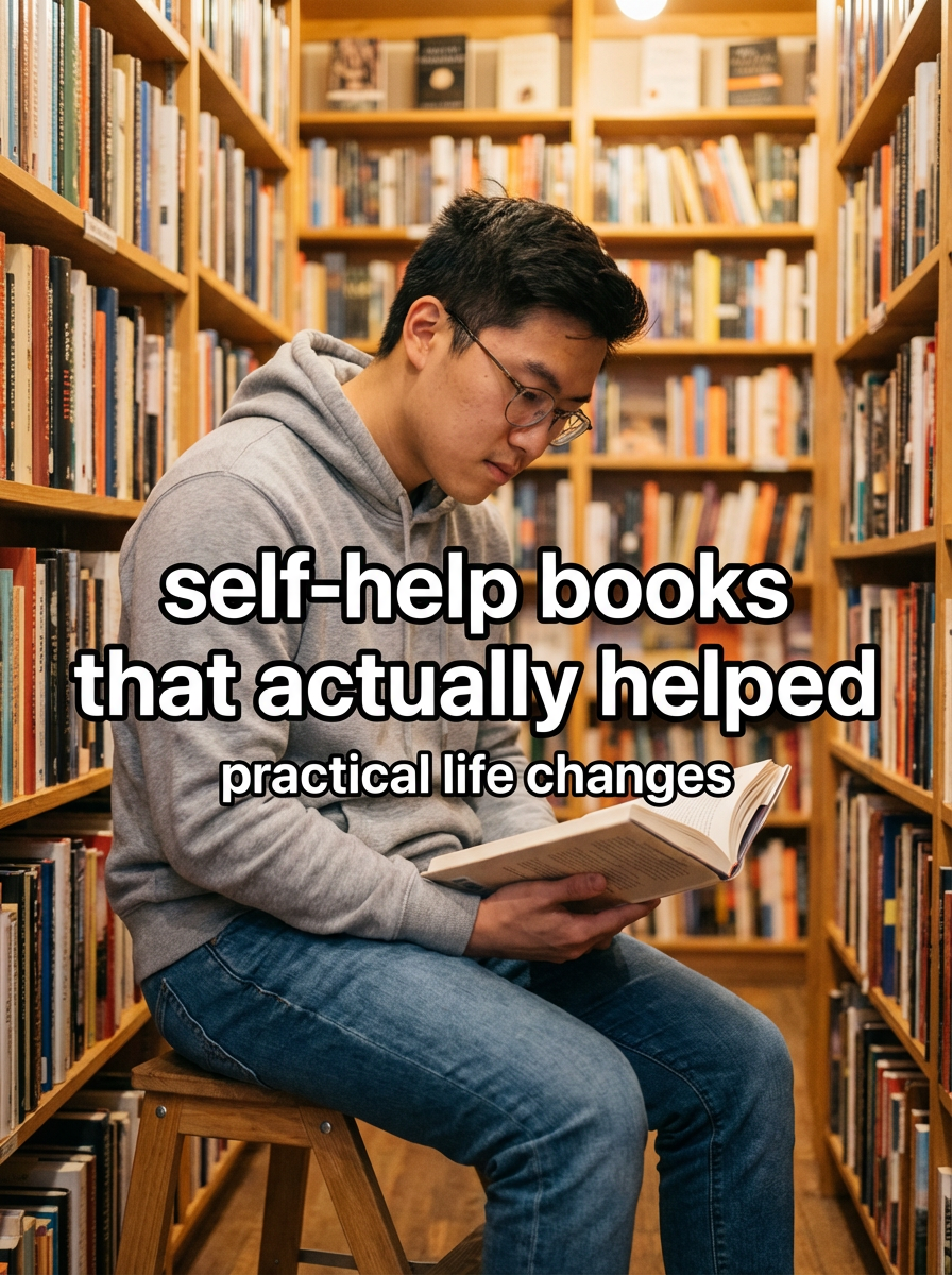 model in casual hoodie and jeans in bookstore or library, surrounded by books, reading, warm lighting. TikTok-style text overlay with white text with black outline: "self-help books that actually helped" smaller text: "(practical life changes)", do not show tiktok interface or logo