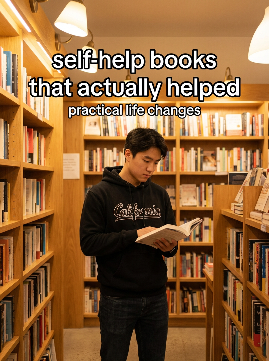 model in casual hoodie and jeans in bookstore or library, surrounded by books, reading, warm lighting. TikTok-style text overlay with white text with black outline: "self-help books that actually helped" smaller text: "(practical life changes)", do not show tiktok interface or logo