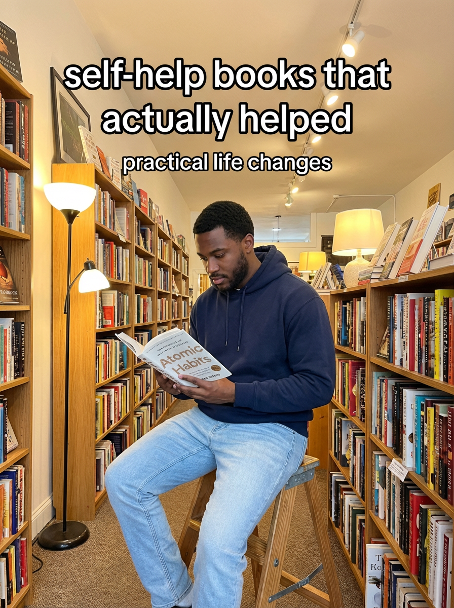 model in casual hoodie and jeans in bookstore or library, surrounded by books, reading, warm lighting. TikTok-style text overlay with white text with black outline: "self-help books that actually helped" smaller text: "(practical life changes)", do not show tiktok interface or logo