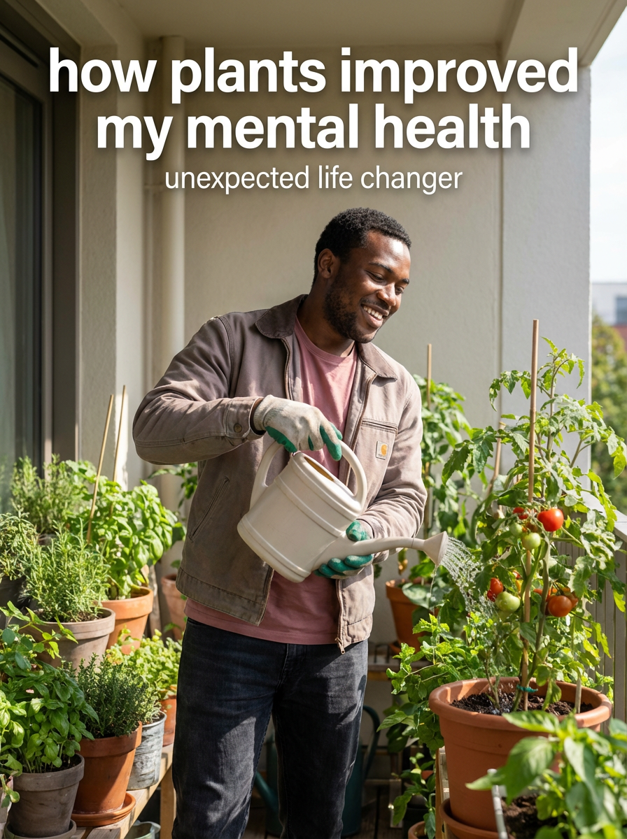model in casual outdoor clothes tending to plants in apartment or balcony garden, natural sunlight, green plants everywhere. TikTok text overlay: "how plants improved my mental health" smaller text: "(unexpected life changer)", do not show tiktok interface